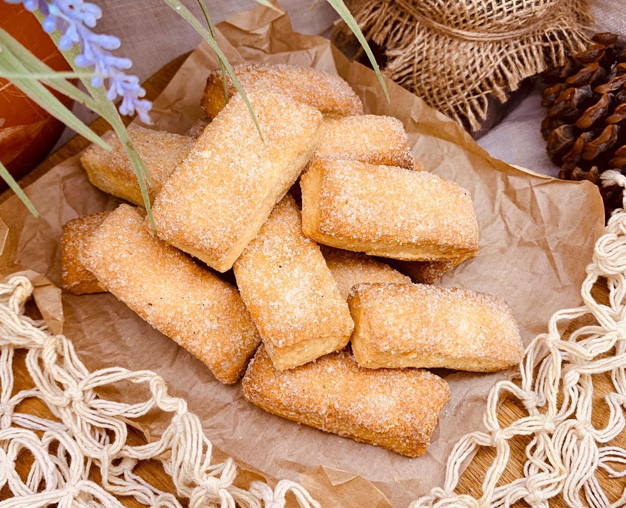 Сдобное тесто в форме палочки посыпано сахаром с ароматом ванили.