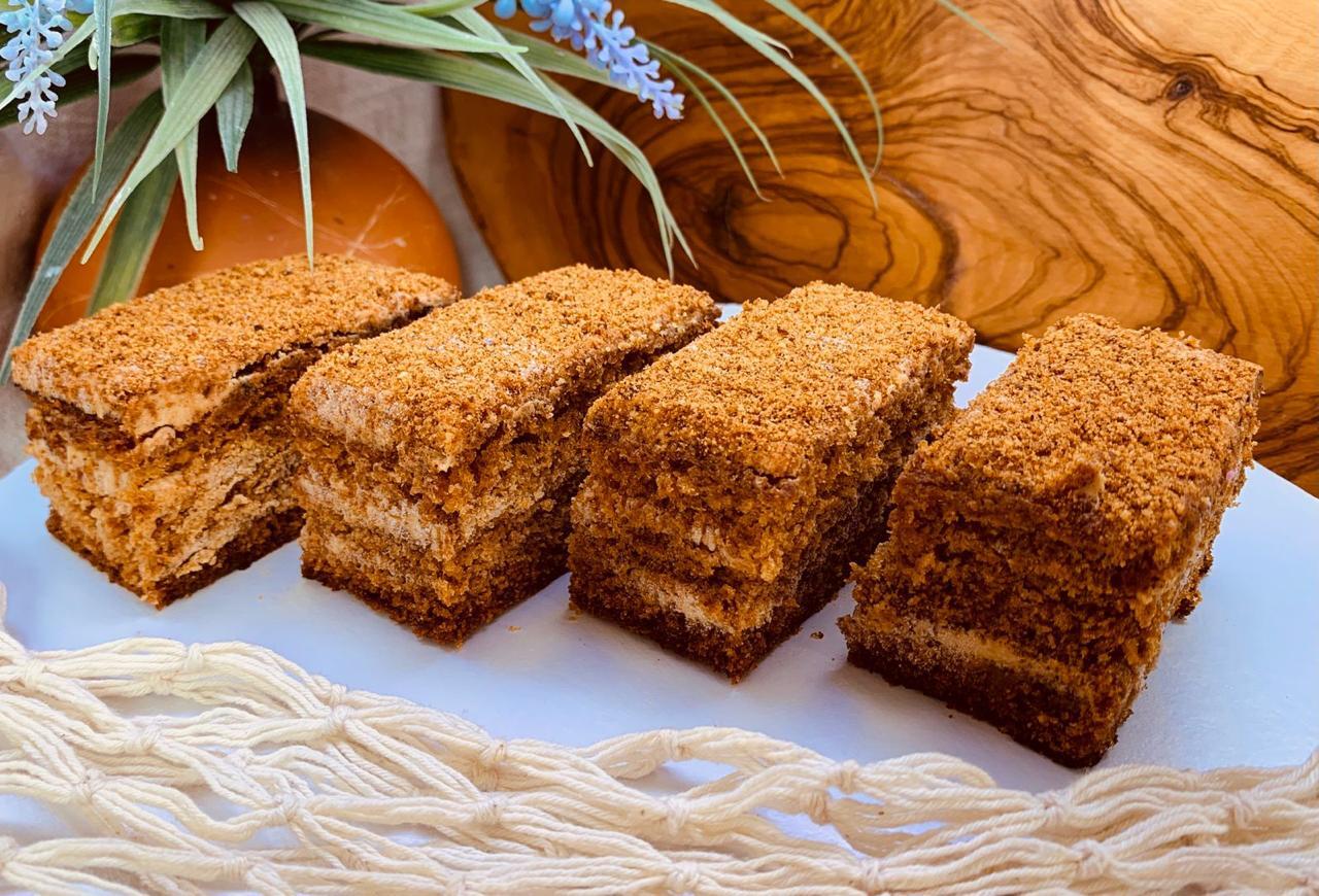 Медовый бисквит с кремом из сливочного масла и вареного сгущенного молока.