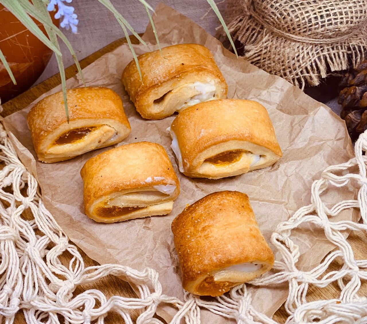 Рулет из песочно-дрожжевого теста с творожной и фруктовой начинками.