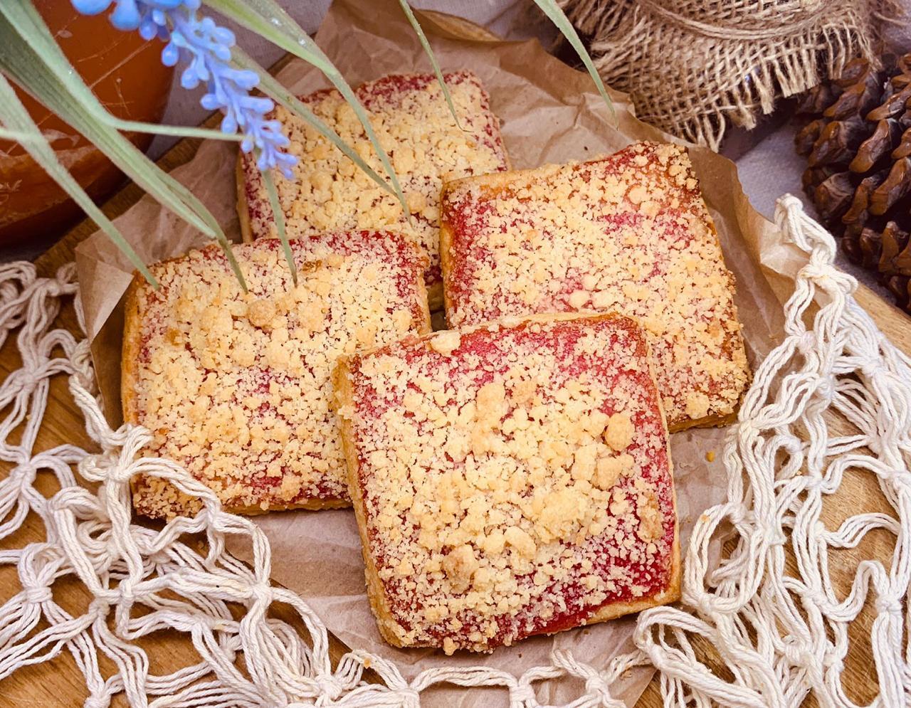Нежное песочное печенье квадратной формы с малиновой начинкой сверху, посыпанное кондитерской крошкой.