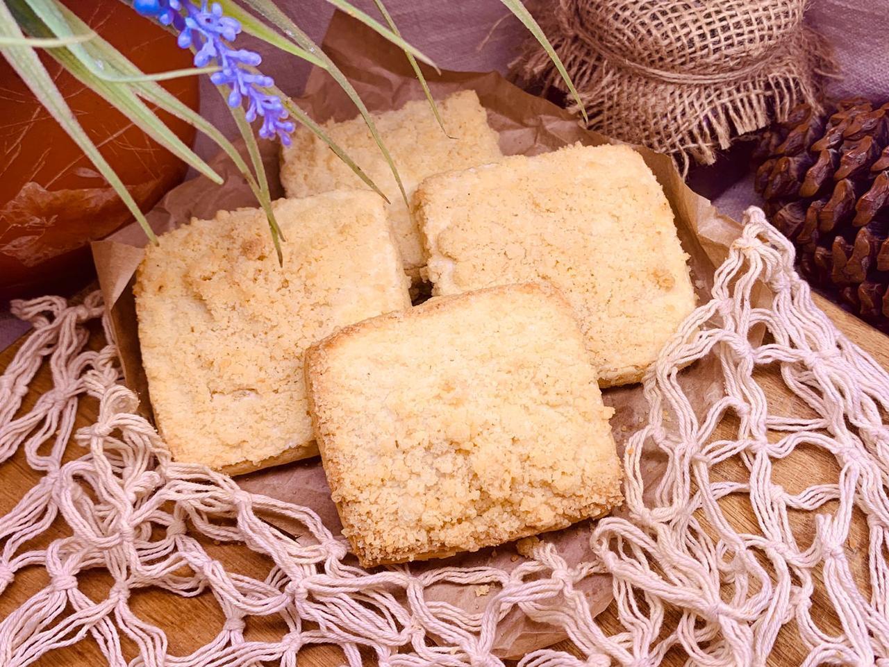 Нежное песочное печенье в виде квадратиков с творожной начинкой сверху, посыпанное кондитерской крошкой.