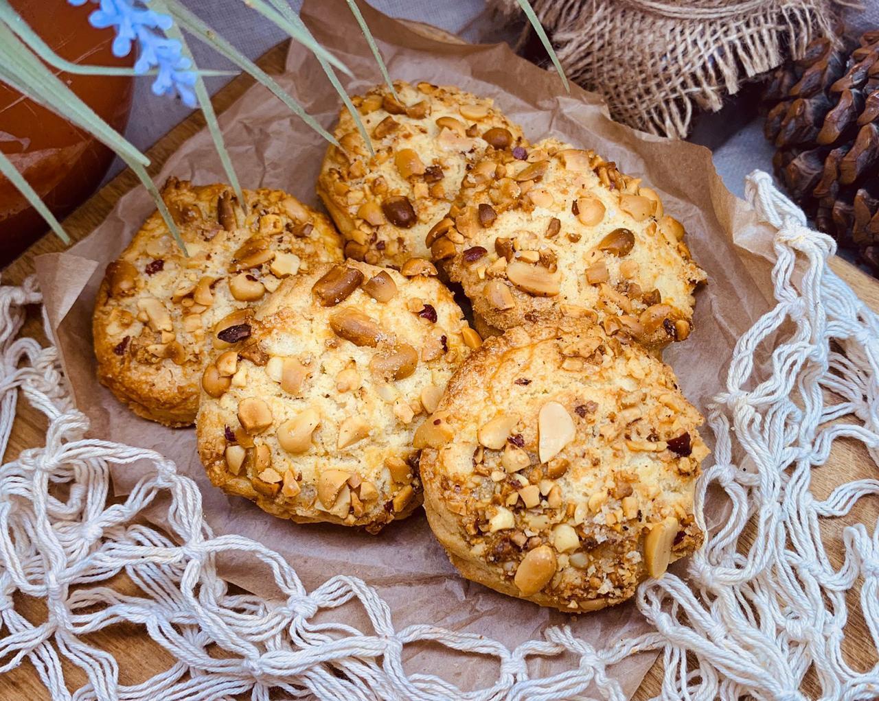 Круглое песочное печенье, покрытое подсоленным жареным арахисом.